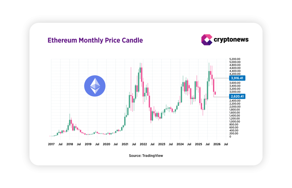 Если посмотреть на динамику Ethereum с 2020 года, то декабрьское закрытие почти всегда оказывалось выше, чем годом ранее. Единственным исключением стал период 2021–2022 годов, когда ETH обрушился почти на 67,5%. После этого тренд снова вернулся к росту.