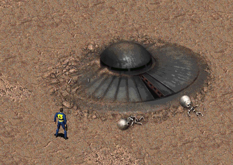 Кроме грузовика, высокая Удача (не обязательно 10) в Fallout открывает доступ к встрече с разбившейся летающей тарелкой, где можно подобрать инопланетный бластер – одно из лучших орудий в игре, правда, эффективная дистанция у него всего 10 клеток.