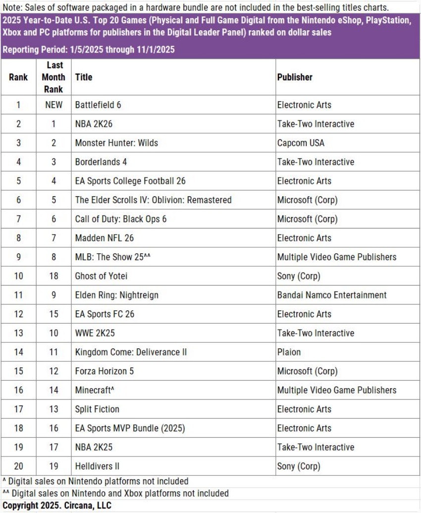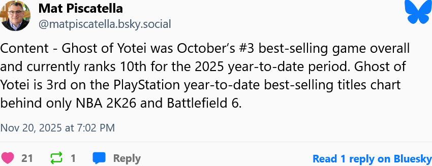 В октябрьском чарте продаж игра заняла третье место, уступив лишь Battlefield 6 и Pokémon Legends: Z-A. Однако более значимым достижением стало попадание Ghost of Yotei в топ-10 самых продаваемых игр 2025 года в США – тайтл занимает десятую строчку. Это единственная игра для одной платформы в топ-20 списка. На Playstation же у тайтла третье место за весь год, впереди только Battlefiled 6 и NBA 2K26. Вероятно, игра уйдет на дальние позиции, когда появятся данные по продажам Black Ops 7 – серия Call of Duty очень популярна в США и на PS5.