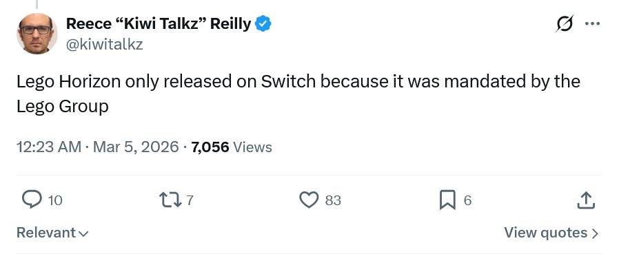 Журналист Рис "Kiwi Talkz" Рейли, известный подробными интервью с ключевыми разработчиками индустрии, написал в социальных сетях, что релиз на Nintendo Switch был не стратегическим решением Sony, а прямым условием со стороны Lego Group. По его словам, именно датская компания настояла на мультиплатформенном выпуске как обязательном условии сотрудничества: