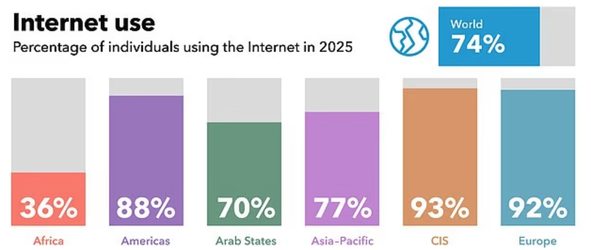 Африка демонстрирует самый низкий уровень использования интернета – только 36% жителей континента когда-либо выходили в сеть. За ней следуют арабские государства с 70% и Азиатско-Тихоокеанский регион с 77%. В то же время в Европе и Америке офлайн остаются лишь 8–12% населения.