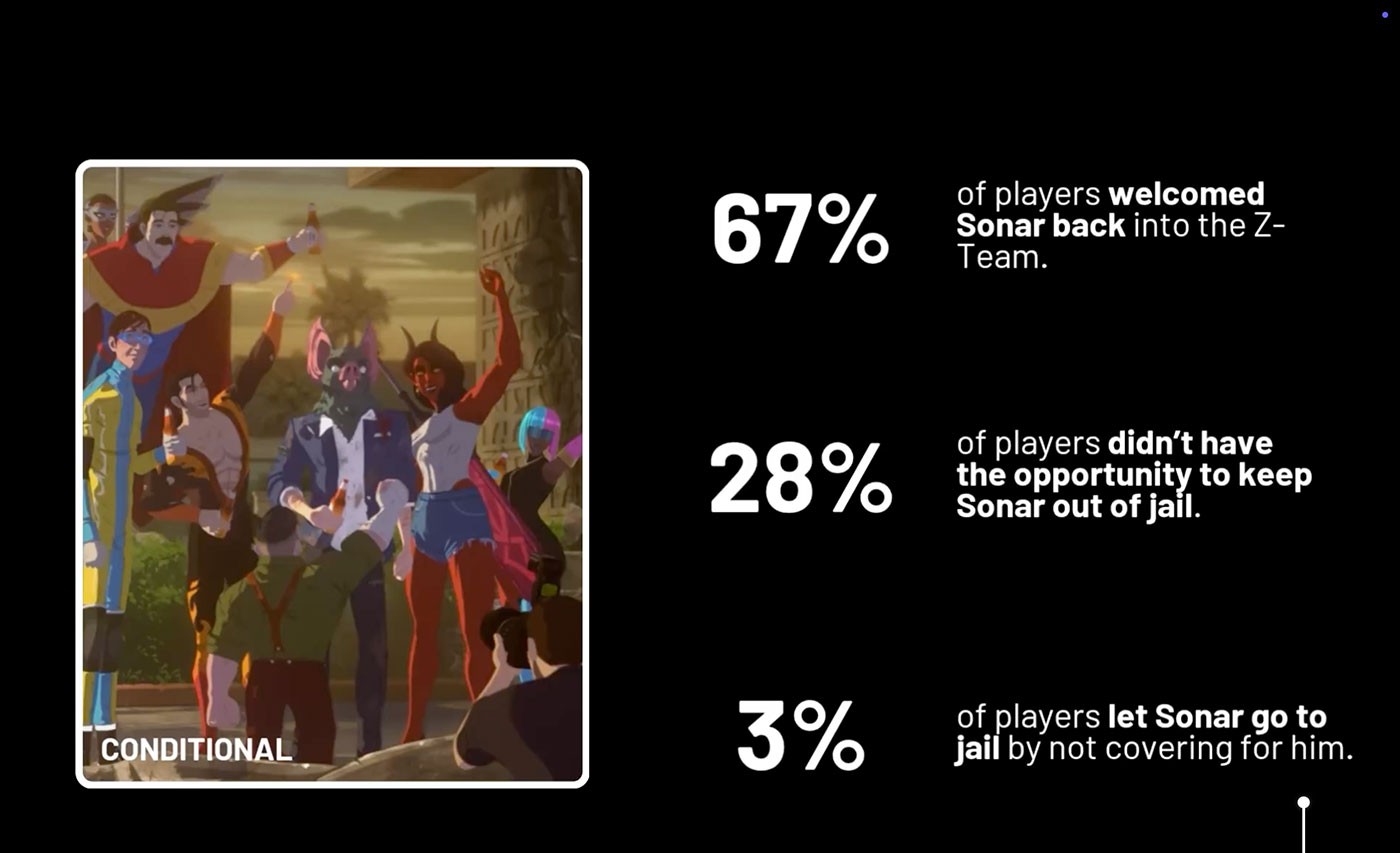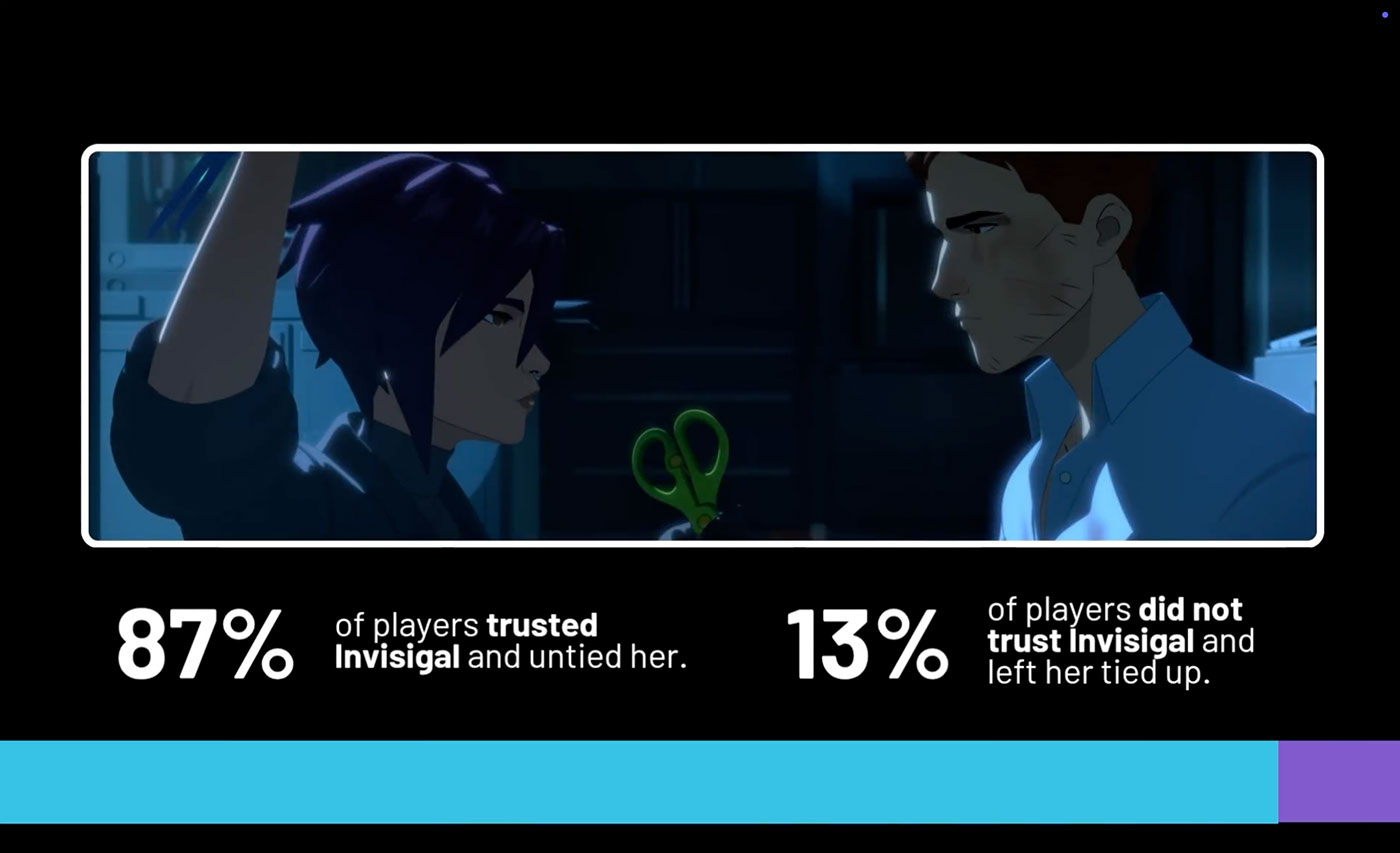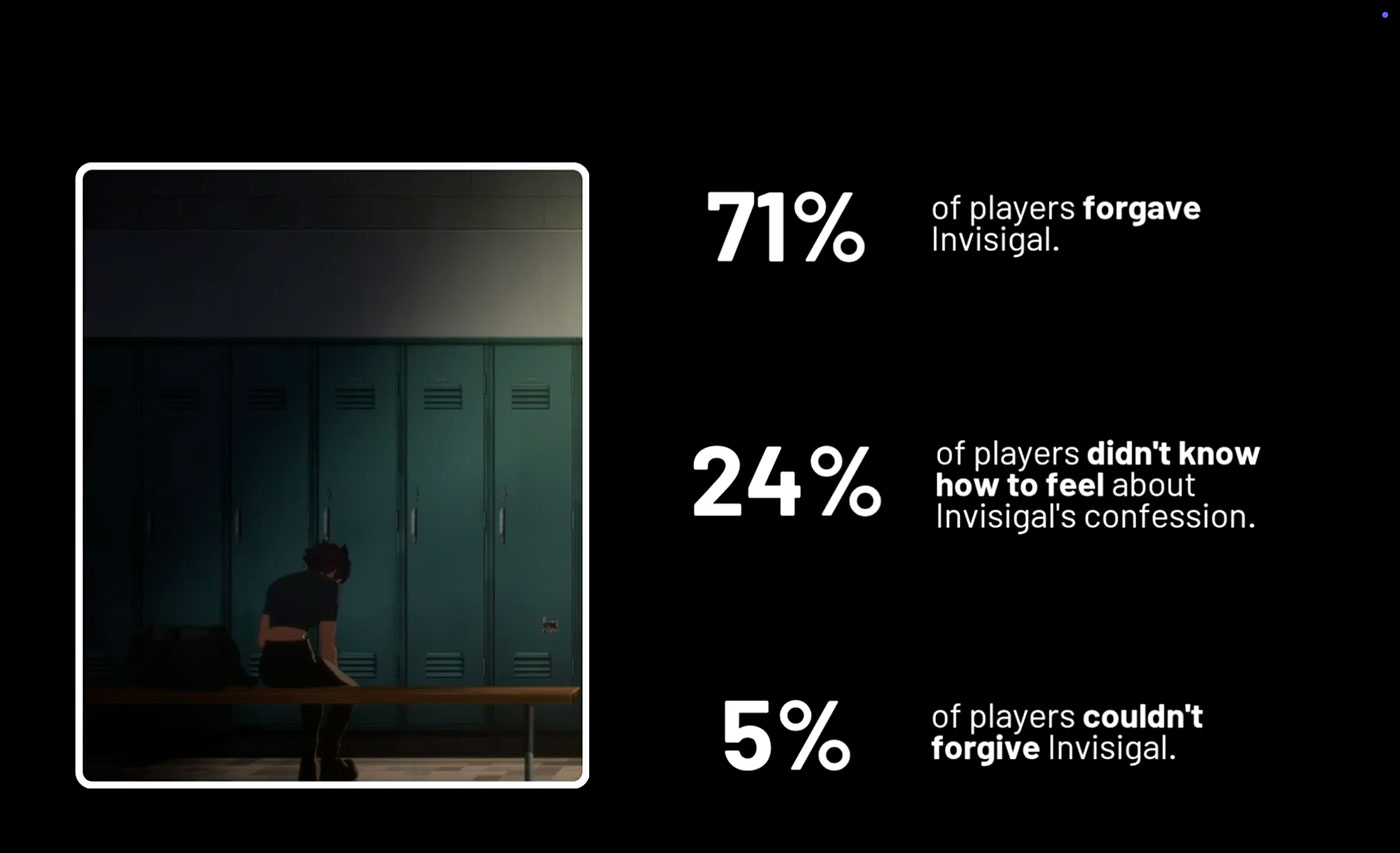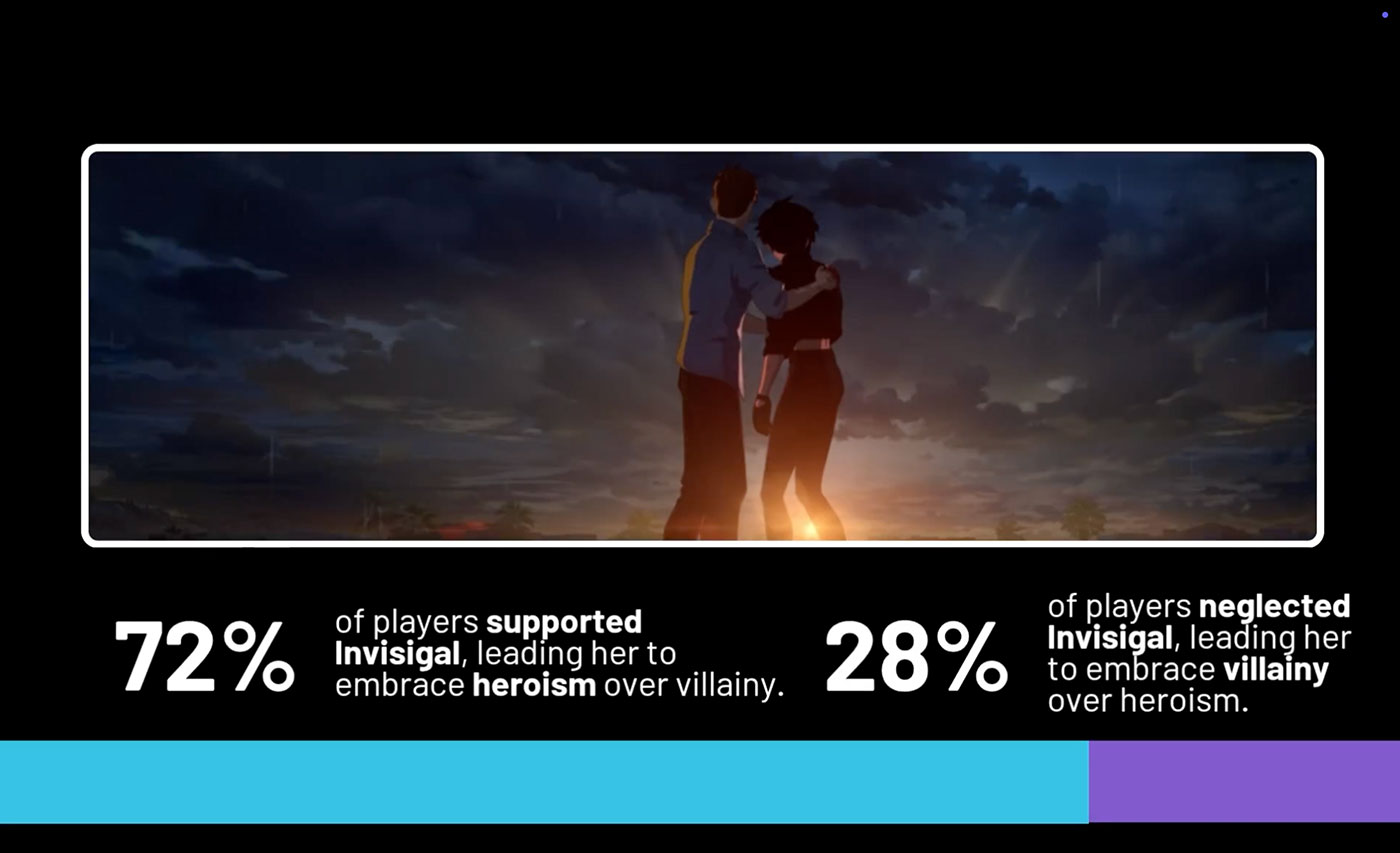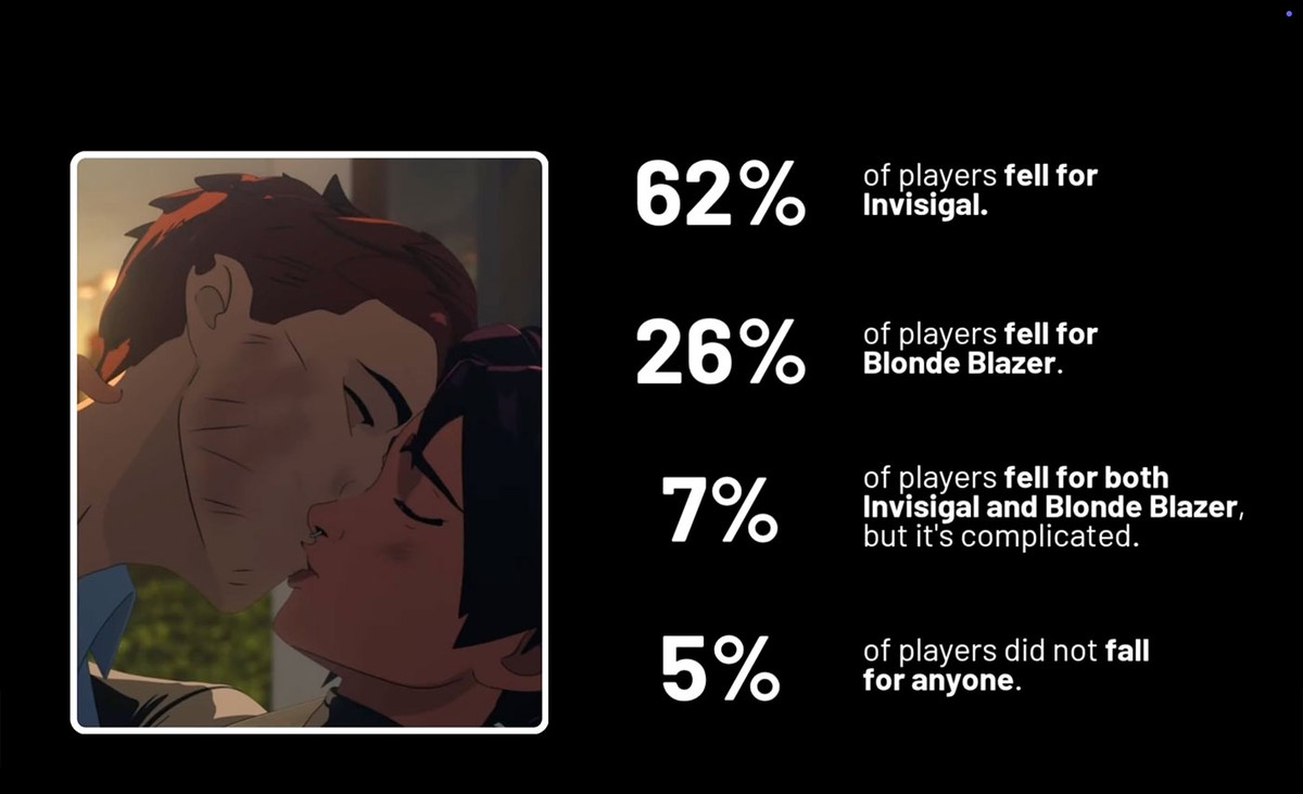Если математика кажется неполной, то дело в том, что 7% игроков влюбились в обоих персонажей, что привело к статусу "всё сложно", а 5% вообще ни в кого не влюбились. Видео также содержит множество других интересных статистических данных, и все они чётко показывают, насколько сильно игроки полюбили Инвизигал – большинство прощало её и доверяло ей раз за разом, когда появлялась возможность.