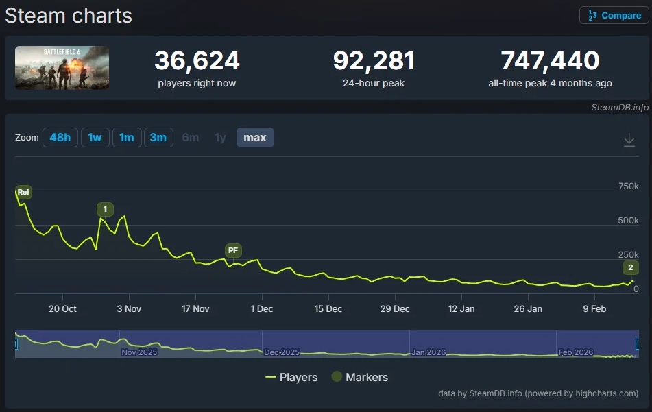 Для сравнения: в октябре 2025 года при релизе Battlefield 6 достигла пика в 747.440 одновременных игроков.