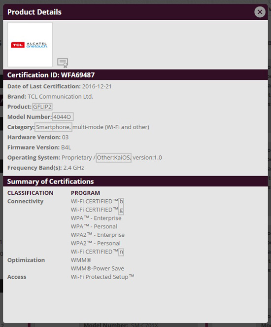 Тем странее, что Go Flip, судя по фото, был раскладушкой-бабушкофоном, а вовсе не устройством с поддержкой Wi-Fi. Загадочности ситуации добавляет и упоминание в каталоге Wi-Fi Alliance операционной системы KaiOS версии 1.0, на которой будет работать Gflip2. Никаких сведений об операционной системе с таким названием нам найти не удалось. Надеемся, что многие вопросы получат ответы в ходе CES 2017. Отметим, что в разделе про нотификации IEEE на сайте Alcatel загадочный 4044O уже появился, причём вместе с 4044T и 4044W.