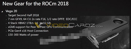 Во второй половине 2018 года дебютирует 7-нм видеоускоритель Vega 20 с 64 CU-блоками и 16–32 Гбайт памяти HBM2. У данного адаптера будут реализованы интерфейс PCI Express 4.0 и поддержка технологии xGMI (аналог NVLink).
