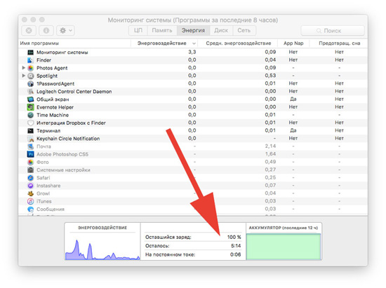 В большинстве случаев именно это является причиной некорректного прогнозирования времени работы портативного компьютера от батареи, так как все эти процессы происходят в фоне и сильно нагружают процессор. Учитывая эти факторы, в Apple посчитали целесообразным отказаться от счетчика времени в верхней строке меню MacBook. При этом приблизительное время работы ноутбука без подзарядки можно найти в стандартном приложении Мониторинг системы на вкладке Энергия.