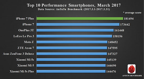 Согласно свежему рейтингу производительности AnTuTu, смартфоны iPhone 7 и iPhone 7 Plus в марте занимали первые места по производительности среди всех мобильных устройств на рынке. Текущий лидер iPhone 7 Plus со средним результатом 181 494 баллов опережает самый мощный Android-смартфон OnePlus 3T почти на 20 000 баллов.