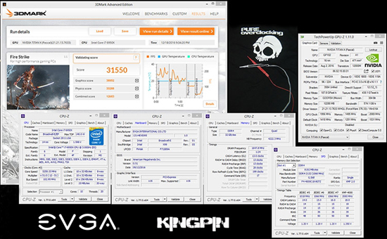 В свою очередь, вышеупомянутый K|ngp|n достал из закромов отборный экземпляр видеокарты NVIDIA TITAN X и взял «золото» в дисциплине 3DMark Fire Strike. Результат в 31 550 «попугаев» оказался на целых 549 очков выше предыдущего рекорда. Частота GPU составила 2442 МГц, а из 10-ядерного процессора Core i7-6950X Винс выжал 5250 МГц.