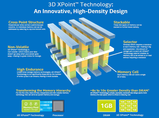 «3D XPoint является революционной технологией памяти, которая позволяет свести к минимуму те компромиссы в отношении стоимости, производительности и энергопотребления устройств, на которые обычно вынуждено идти большинство производителей систем при проектировании решений для хранения данных и памяти. Новая технология обеспечивает значительно более высокую плотность по сравнению с DRAM и значительно более высокую скорость по сравнению с NAND, что позволяет нам размещать данные ближе к центральному процессору», — заявляют в Intel.