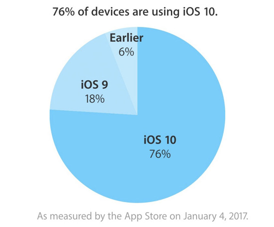 Apple обнародовала официальную статистику распространения операционной системы iOS 10, согласно которой актуальная версия ОС сейчас установлена на 76% устройств, совместимых с ней. Таким образом, «десятка» опережает по скорости распространения предыдущие варианты прошивки для iPhone и iPad.