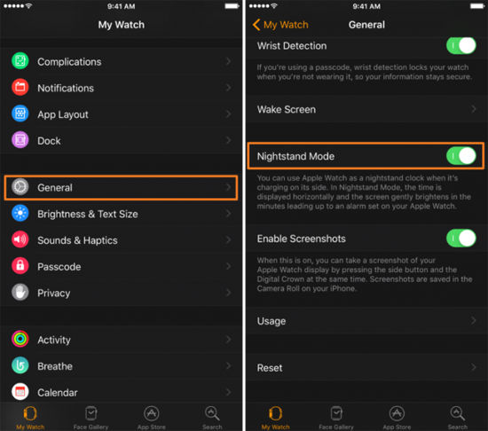 Способов два. Первый использует iPhone, с которым у часов создана пара. На смартфоне нужно запустить приложение Watch и перейти к следующим настройкам: General → Nightstand Mode. Функция активируется на часах сразу после переключения тумблера. На всякий случай уточню: часы будут отображать большими зелеными цифрами время, а также круговой индикатор заряда. При этом экран продолжит работать в течение 30 секунд, после чего его нужно будет разблокировать с помощью прикосновения к экрану или нажатия на Digital Crown. Для дальнейшей работы с часами потребуется ввод пароля, поскольку они автоматически блокируются при снятии с руки.