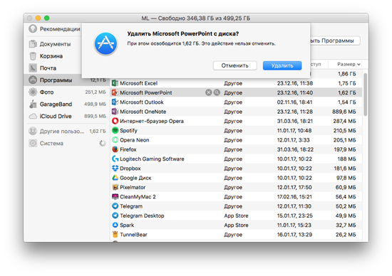 Если вам необходимо удалить какое-нибудь приложение, то перейдите в соответствующую вкладку. Здесь можно отсортировать данные по размеру, названию и частоте использования. Чтобы удалить приложение достаточно нажать на его иконку правой кнопкой. При удалении приложения подобным способом, macOS удаляет все его данные из корневой директории, сохраняя данные, которые хранятся в других папках. Поэтому, если вы не хотите удалять эти данные вручную, то можно воспользоваться профессиональным софтом для удаления приложений и их данный в macOS. Например, CleanMyMac.