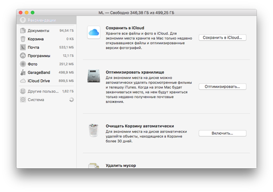 Также из стандартного меню управления дисковым пространством можно очистить корзину, инициировать процедуру загрузки библиотеки фотографий в облачное хранилище iCloud, очистить кэш почты и провести ряд других процедур.