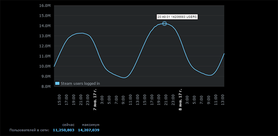 Количество одновременно находящихся в Сети пользователей Steam недавно перевалило за 14 миллионов. В частности, вечером 7 января это число впервые добралось до отметки 14,2 миллиона. На момент написания новости количество одновременных пользователей Steam составляло около 11,2 миллиона и продолжало расти.