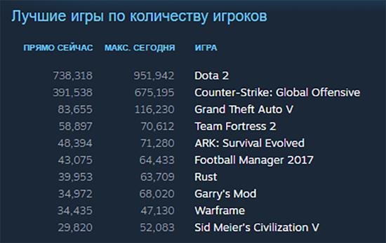 Во время пика проектом с самым большим числом одновременных игроков стала Dota 2 — почти 952 тысячи играющих людей. За ней последовал мультиплеерный шутер Counter-Strike: Global Offensive с примерно 675 тысячами игроков, а замкнул тройку лидеров экшен с открытым миром GTA V, просторы которого одновременно исследовало 116 тысяч игроков Steam.