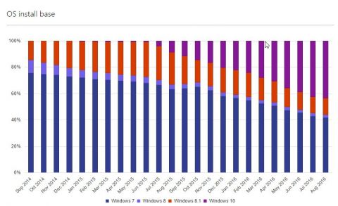Microsoft утверждает, что в августе доля Windows 10 была 43%, тогда как у Windows 7 было 42%, у Windows 8.1 лишь 13%. В августе состоялся релиз обновления Anniversary Update для Windows 10, поэтому рост её доли в том месяце вполне вероятен, однако сложно поверить, что всего за год после релиза она обогнала лидирующую много лет Windows 7. Как бы то ни было, многие пользователи вполне довольны возможностями Windows 7 и не горят желанием уходить с неё по меньшей мере до января 2020, когда будет прекращена поддержка.