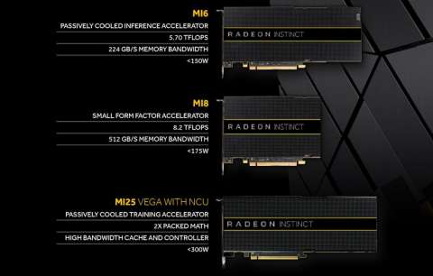 С технической точки зрения, моделей в серии Radeon Instinct всего три. Ускоритель Radeon Instinct MI6 построен на основе архитектуры AMD Polaris GPU и является пассивно охлаждаемой картой с производительностью 5,7 Тфлопс при ускорении FP16. Карта оснащена 16 ГБ видеопамяти. Следующим идёт ускоритель Radeon Instinct MI8, выполненный в меньшем форм-факторе. Несмотря на это, его производительность достигает 8,2 Тфлопс при ускорении FP16. При этом видеокарта оснащена 4 ГБ памяти высокой пропускной способности (HBM). И, наконец, ускоритель Radeon Instinct MI25 построен на архитектуре AMD next-gen Vega GPU.