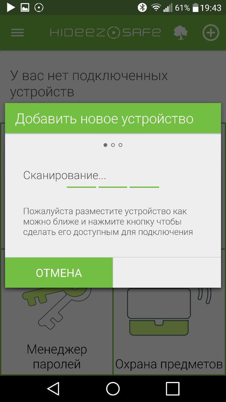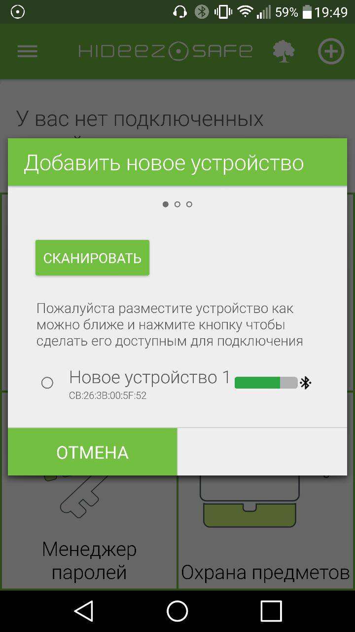 Сопряжение с устройством происходит посредством нажатия на изображение плюса и кнопки “сканировать”. Далее необходимо активировать сам Hideez Key. Для этого достаточно нажать на клавишу и дождаться мерцания встроенного индикатора. Если вы сделали все правильно, в списке отобразится Hideez Key, после чего устройство самостоятельно зарегистрируется. Рекомендуем проходить этап настройки и регистрации дома, и только при использовании доверенной сети, а также стабильного интернет соединения.