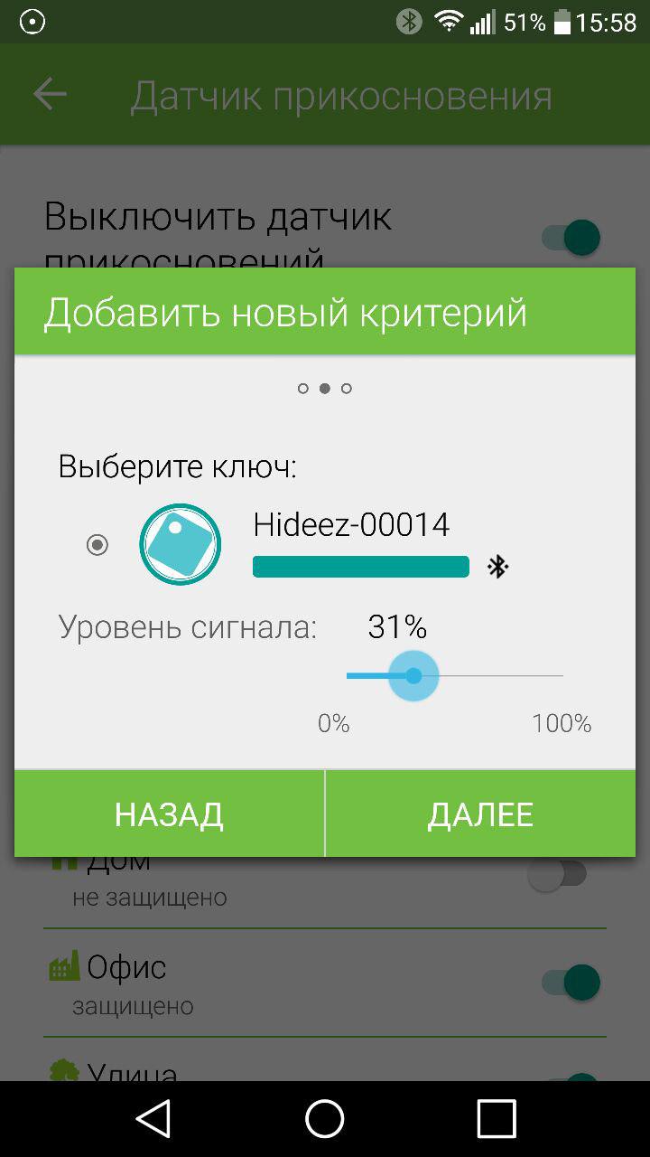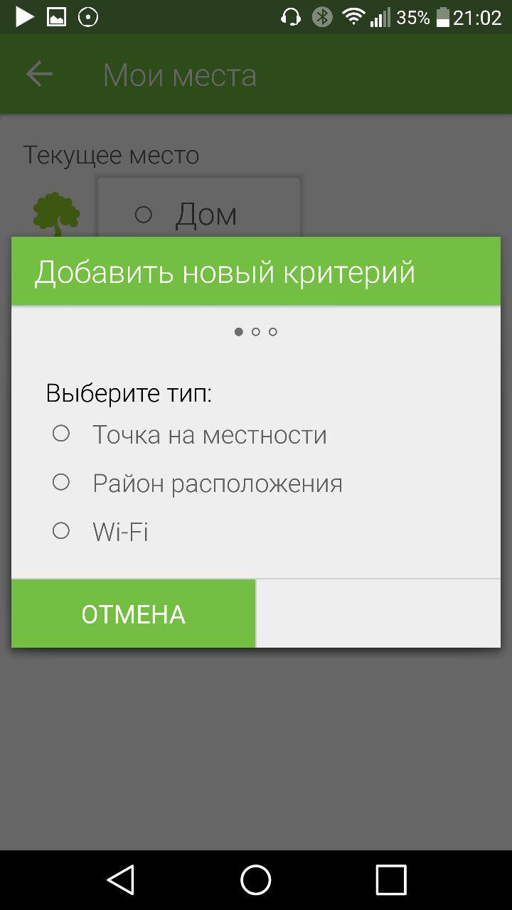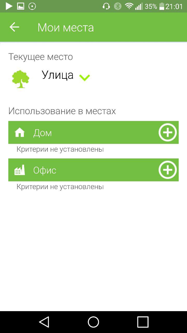 Мои места. Позволяет настроить поведение устройства в различных местах (смотреть следующий пункт). На выбор доступны: улица, дом и офис. Для каждого из этих мест свой критерий доверия и идентификации. Например, для дома критерием идентификации может быть WI-FI, а для офиса – точка на местности или район расположения.
