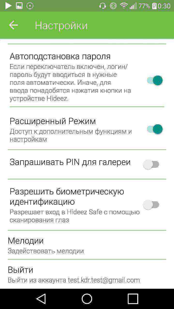 Вверху расположен значок в виде самого Hideez Key. Нажав на него, перед нами появиться панель с информацией об уровне сигнала и заряда, состояние подключения и кнопка звукового сигнала для поиска устройства. Если выбрать изображение стрелки, выпадет меню с различными функциями: свойства, будильник, последнее местоположение, поиск и удаление из аккаунта, резервная копия, обновление прошивки, а также возможность отсоединить метку от смартфона.
