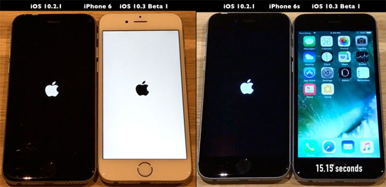 «Это обнаружилось в ходе стандартных тестов. Новая файловая система APFS, представленная в iOS 10.3 beta 1, может похвастаться серьезным преимуществом по скорости загрузки при сравнении со старой файловой системой. Как можно убедиться, скорость загрузки намного выше», – пишет видеоблогер iApple Bytes, протестировавший новую ОС.