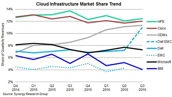 HPE по-прежнему лидирует на рассматриваемом рынке, незначительно опережая Cisco. Эти компании, чьи рыночные доли измеряются примерно по 12 %, идут «ноздря в ноздрю» уже четыре года кряду. В июле–сентябре к лидерам приблизилась Dell благодаря покупке EMC за $67 млрд. Следом расположились Microsoft и IBM.