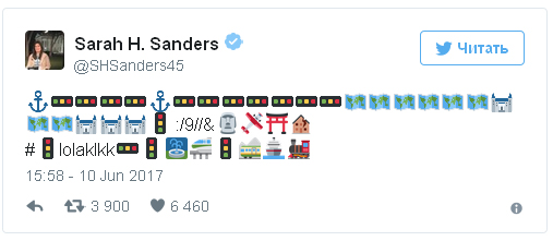Трирічний син першого заступника прес-секретаря Білого дому Сари Хакабі Сандерс грав з залишеним мамою телефоном і залишив в її офіційному "твіттері" веселе повідомлення, що складається з незв'язних букв, цифр і смайликів