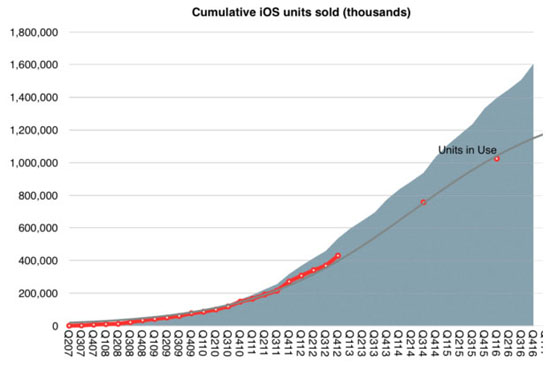 По данным Asymco, в этом году общий доход, который будет сгенерирован устройствами, работающими под управлением iOS, превысит отметку 1 трлн долларов. К середине 2017 года количество проданных смартфонов iPhone достигнет 1,2 млрд штук, общее количество iOS-устройств — 1,75 млрд, а в 2018 году цифра перевалит за 2 млрд.