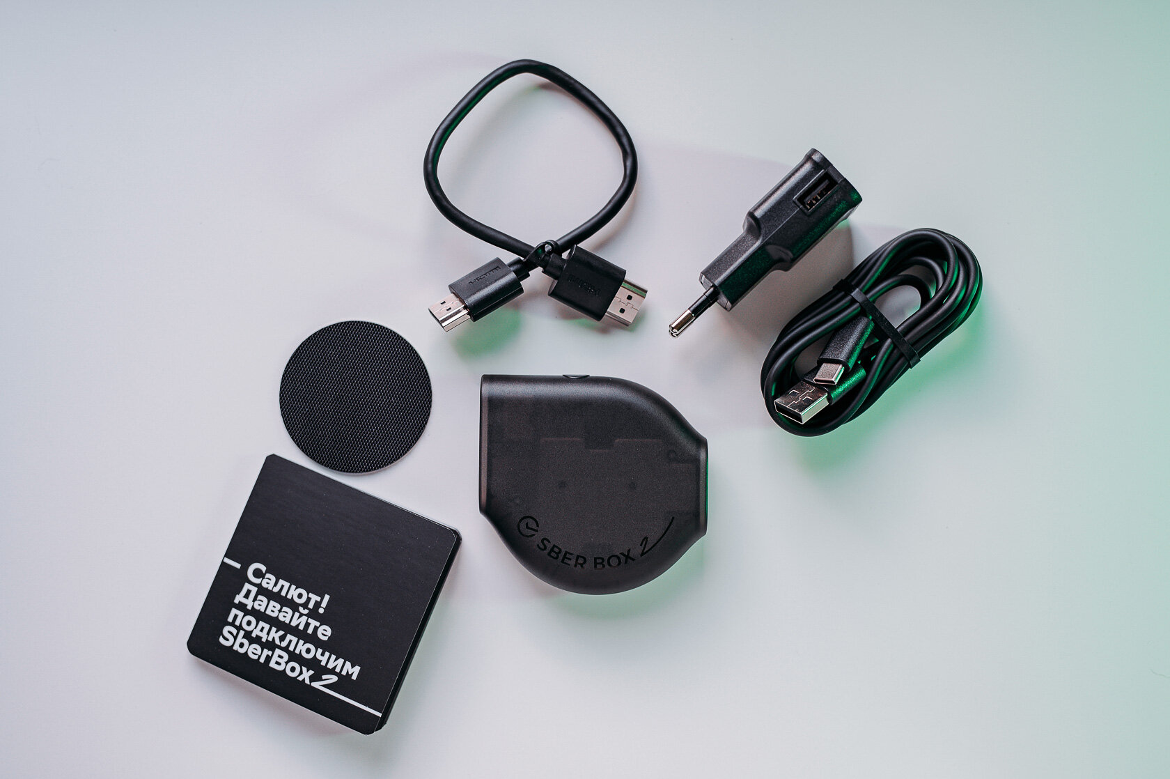 В коробке, помимо самой приставки, имеется адаптер питания и кабель USB Type-C, пульт дистанционного управления и две батарейки типа ААА, съёмный HDMI-кабель, стандартная макулатура и липучка для размещения приставки на тыльной панели телевизора.