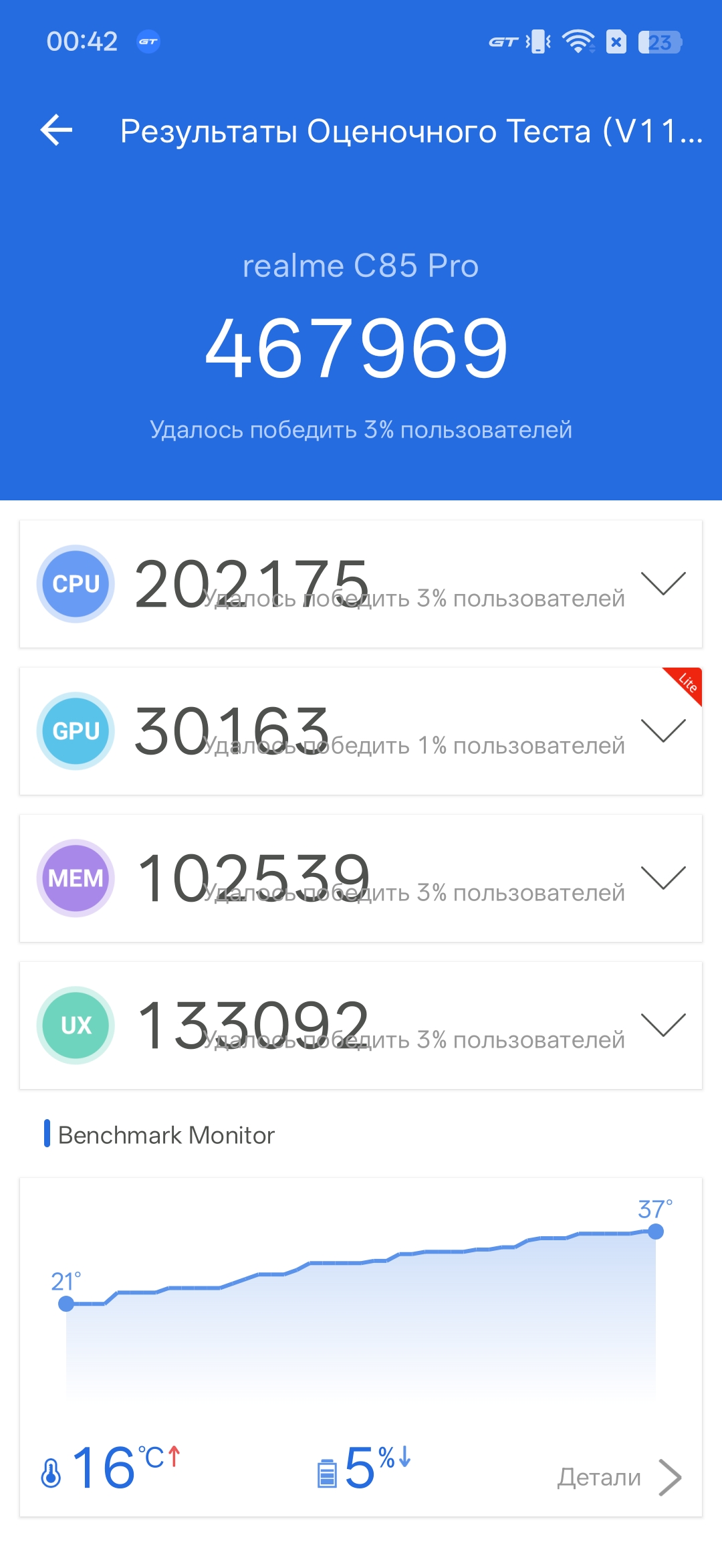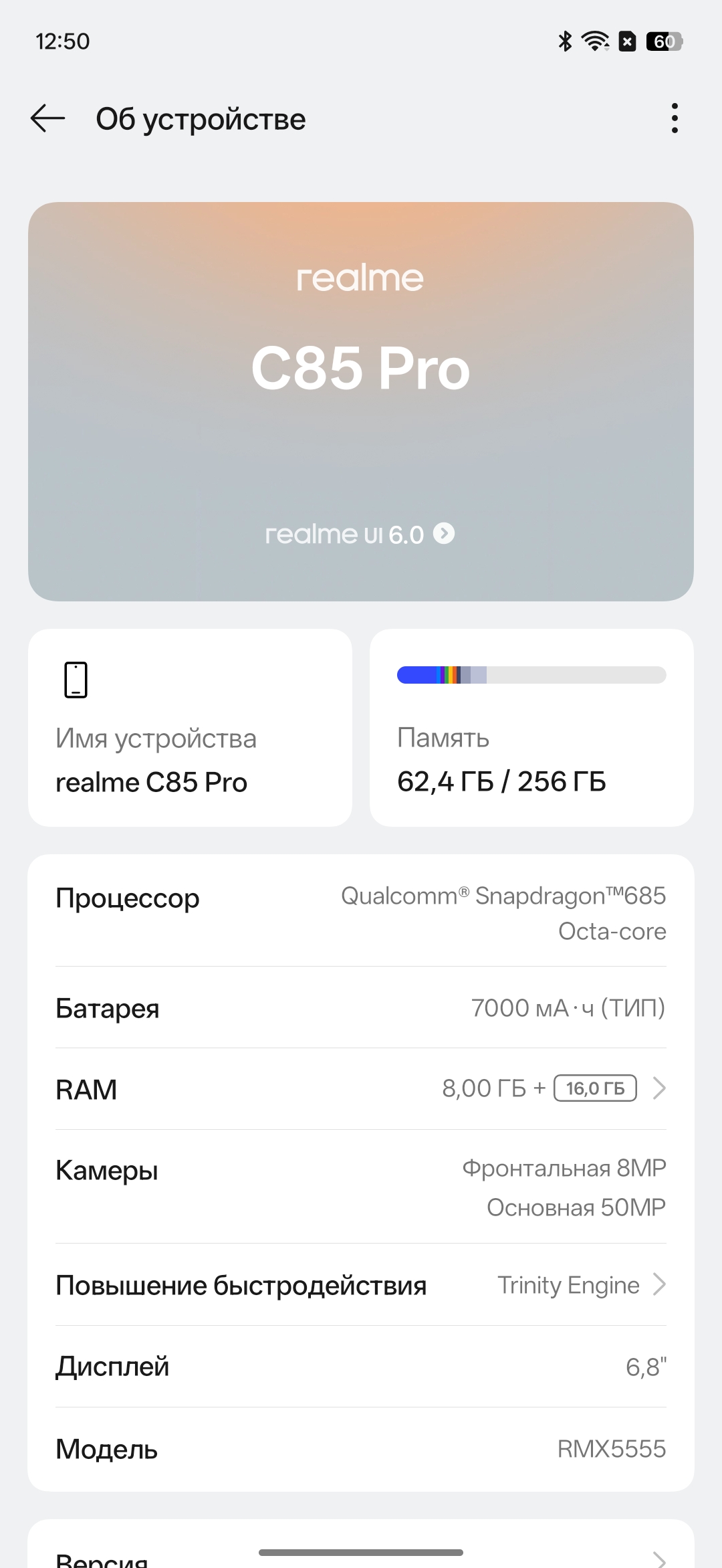 На сегодня телефон использует Android 15 и прошивку Realme UI 6.0. У некоторых Реалмишек уже седьмая версия, но непонятно, когда она прилетит на C85 Pro и прилетит ли вообще. Но, не переживайте, главное тут есть: стеклянный интерфейс. Эффект стекла виден в шторке, в доке и на иконках. Иконпак так и называется – «жидкое стекло». Ценой чего была добавлена вся эта красота? Ценой всего! Тут Snapdragon 685. И старичок, я думаю, прифигел от осознания того факта, ЧТО ему предстоит рендерить, да еще и в FullHD+ разрешении. Короче, интерфейс неторопливый.