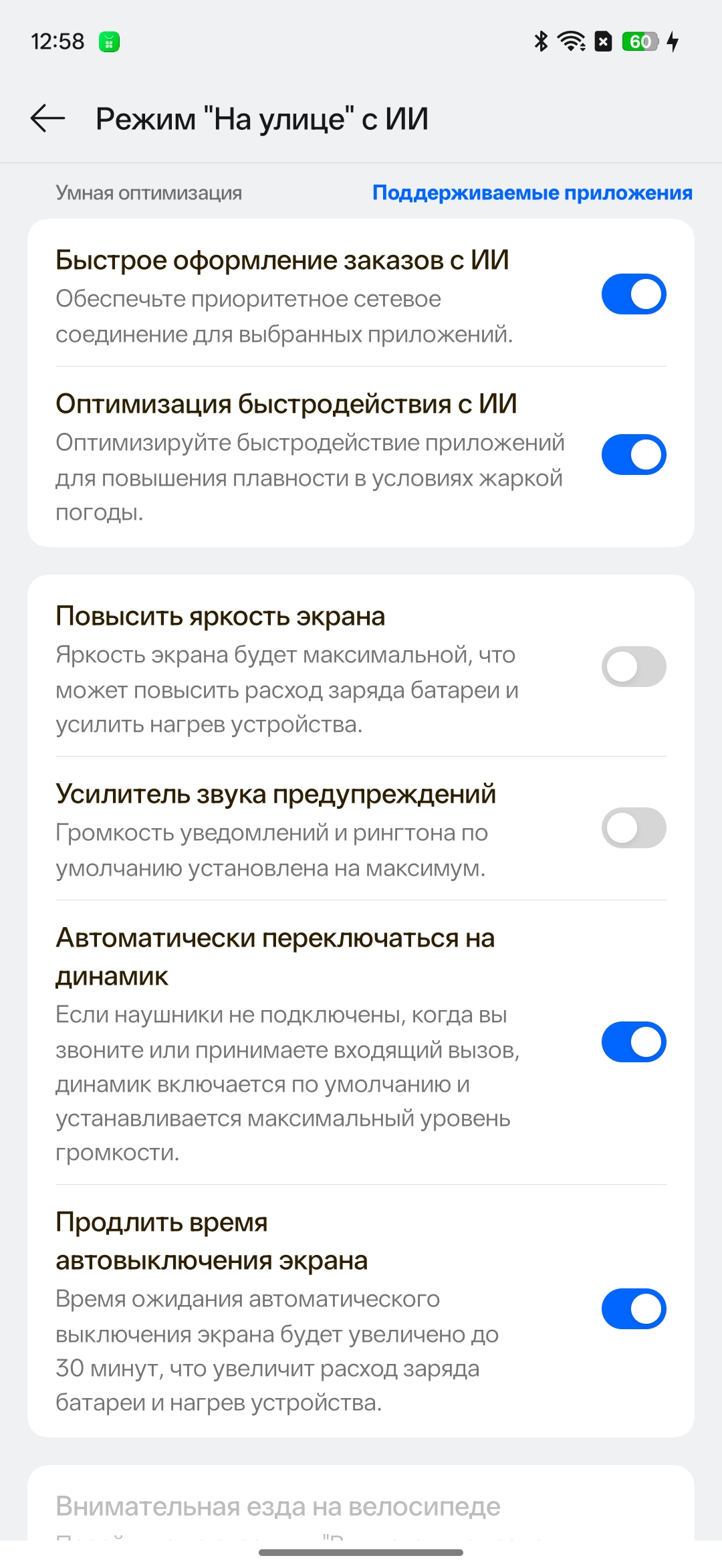 Еще я заметил тут режим «На улице с ИИ». То ли я запамятовал, то ли реально его не было у Realme GT 8 Pro и Realme 16 Pro+, а в бюджетке он есть… Ну, короче, этот режим должен сделать пребывание на улице комфортнее. И судя по тому, что он может автоматически активироваться с приложением Яндекс.Еда для курьеров, именно курьеров компания рассматривает в качестве целевой аудитории для этой защищенной, долгоработющей модели. Также этот режим может приоретизировать программы, чтобы быстродействие и интернет-соединение отдавалось им. Еще повышается яркость, громкость звука и так далее. Даже режим для велосипедистов есть! Короче, курьеры – это, походу, ваша тема.