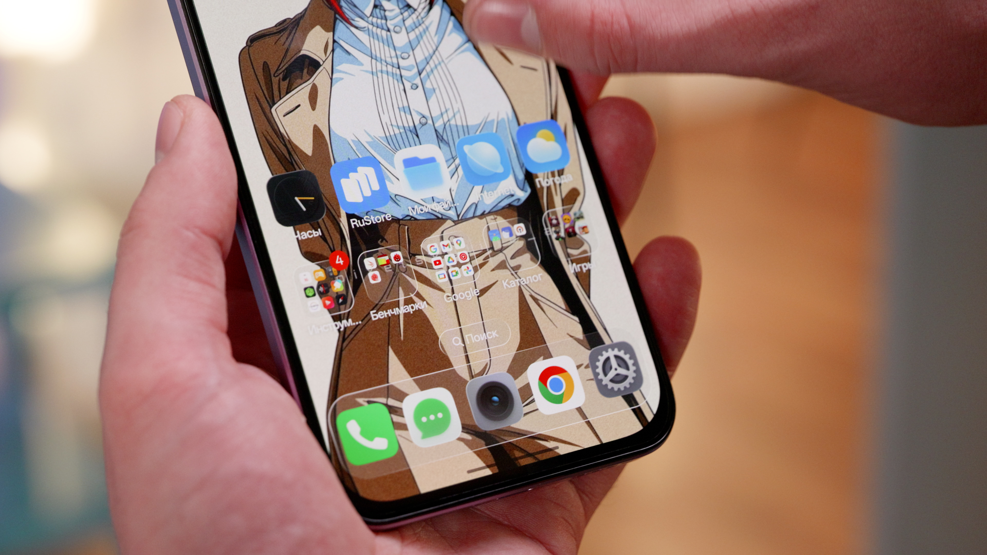 Сам смартфон крупный – размером чуть больше, чем iPhone 17 Pro Max. Но не такой толстый, как Nokia 3310, конечно. Диагональ 6.8” и рамки тут не понравятся перфекционистам. Бюджетка, понятное дело, но можно было бы как-то сбалансировать, наверное – а то боковые, верхняя и нижняя – они все разного размера.