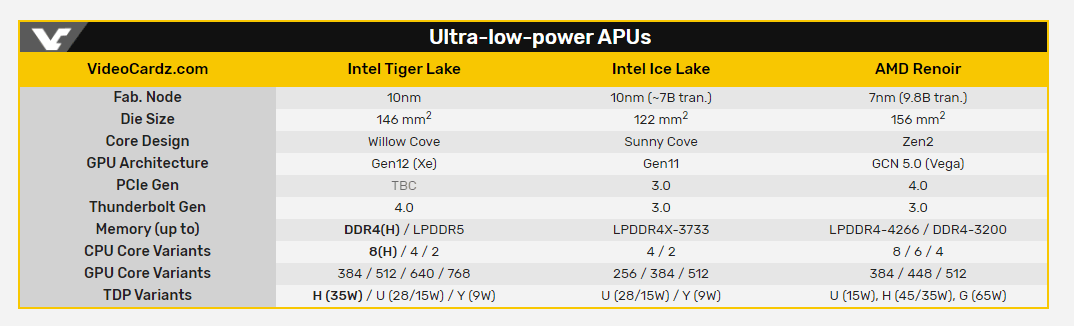 Что же касается более производительных Tiger Lake-H, кроме выросшего до 35-45 Вт уровне TDP и, следовательно, более высоких частот, они, как ожидается, нарастят число физических ядер — до восьми. То есть, будущие Tiger Lake-H выступят полноценными соперниками нынешних восьмиядерных APU Ryzen 4000H. Но тут важно понимать, что к моменту выхода Tiger Lake-H на рынок, AMD, скорее всего, уже выпустит Ryzen 5000H. К слову, Tiger Lake-H станут первыми 10-нанометровыми CPU Intel высокопроизводительных ноутбуков (игровых и рабочих станций), так как нынешнее 10-нм семейство Ice Lake представлено только линейками Ice Lake-U и Y.